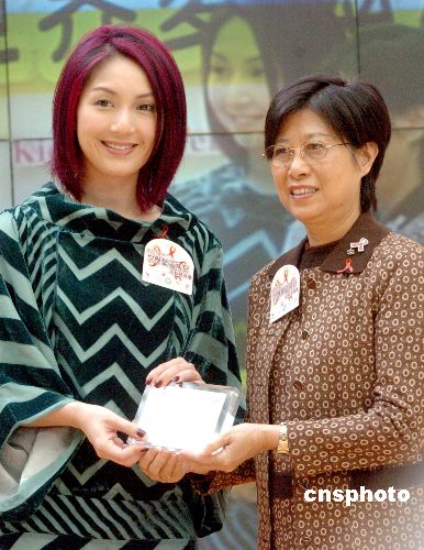 11月30日,“世界爱滋病日2007活动开展礼”在香港举行开启仪式,行政长官夫人曾鲍笑薇代表大会向艺人杨千嬅致送纪念品,以感谢她为活动拍摄宣传短片,推广正视对抗爱滋病的讯息。中新社发 邓庆乐 摄