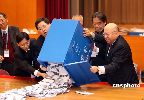 12月2日深夜,香港选管会主席彭键基[右]及政制及内地事务局局长林瑞麟[左二]到达票站,开启票箱,票站内点票工作随即展开。当日,香港立法会港岛区补选共有八名候选人竞逐一个议席,分别是:柳玉成、李永健、萧思江、叶刘淑仪、蒋志伟、凌尉云、陈方安生、以及何来。中新社发 洪少葵 摄