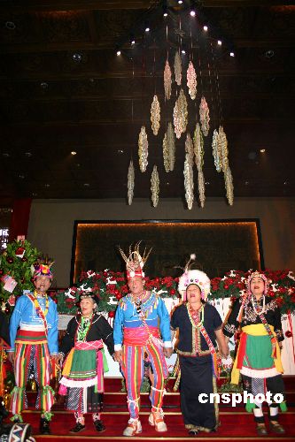 十二月五日下午,古色古香的台北圆山饭店举行圣诞点灯仪式,并请来原住民作为大地的代言人,从大地采光,点燃圣诞之灯。据了解,今年圆山饭店的圣诞树造型的灯使用环保材料,圣诞之后,仍可用作日常的照明。中新社发 陈国华 摄