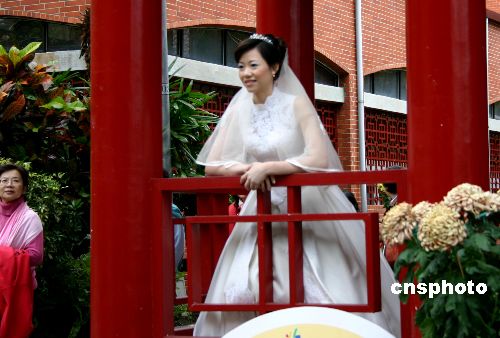 12月6日,一位新人在台北士林官邸举办的菊展中拍摄婚纱照。中新社发 陈国华 摄