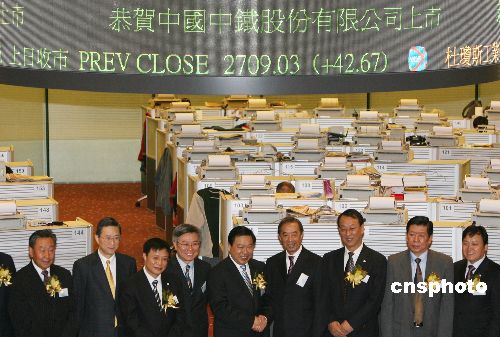 十二月七日,中国中铁在香港挂牌上市。中国中铁董事长石大华(右五)在上市仪式后表示,“先A后H”的上市模式非常成功,他对中铁在上海及香港的股价表现都非常满意,但日后大型国企是否都采纳先A后H的模式,要由中央领导决定。中新社发 武仲林 摄