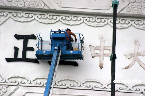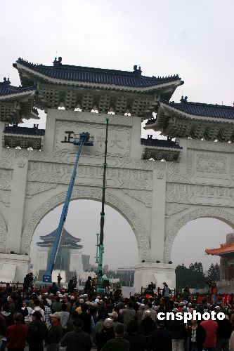 十二月七日,历时近七个小时的施工,台北“中正纪念堂”悬挂二十七年的“大中至正”牌匾被拆除。数百名民众在大门外广场观看。中新社发 董会峰 摄
