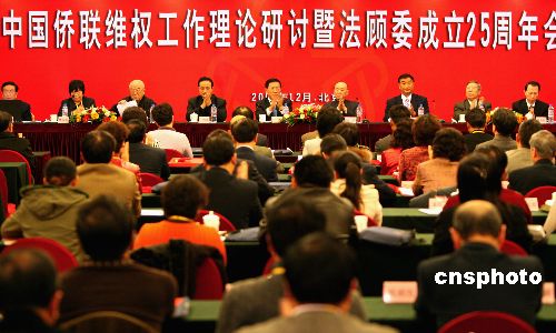 12月8日至9日,中国侨联维权工作理论研讨暨纪念法顾委成立25周年会议在北京召开,会议表彰了近五年来各地侨联维权工作先进单位和个人。会议就建立维权长效机制,切实维护归侨侨眷和海外侨胞在国内的合法权利和利益进行理论研讨。中国侨联法顾委是1982年5月6日成立的中国侨联高层法律服务顾问机构。中新社发 张勤 摄