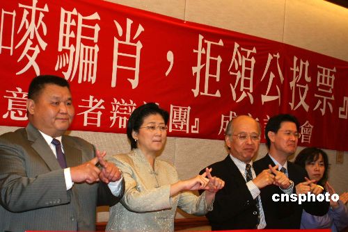 十二月十日,台湾民间团体“民主行动联盟”在台北举行记者会,宣布由十多位学者、名嘴组成“入、返联公投”反方意见辩论团。“民主行动联盟”总召集人黄光国教授(左三)并呼吁民众,为了摆脱民粹政治、不激化两岸关系,拒领“入、返联公投”票。中新社发 董会峰 摄