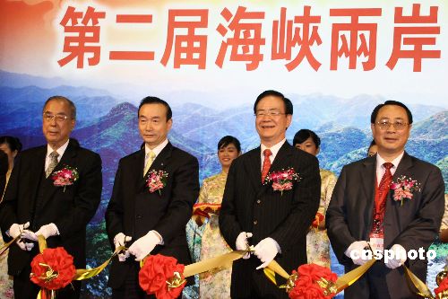 十二月十四日,“第二届海峡两岸台北旅展”在台北世贸展馆开幕。台湾观光协会会长张学劳(左三),来自大陆方面的海峡两岸旅游交流协会副秘书长范贵山(左二)等人为开幕式剪彩。中新社发 董会峰 摄