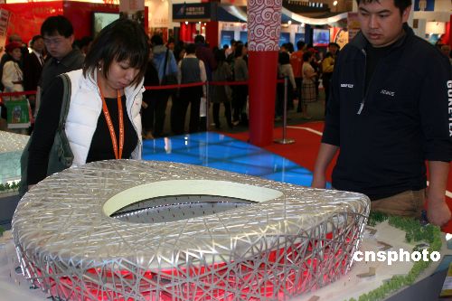 十二月十四日,第二届海峡两岸台北旅展在台北世贸展馆开幕。图为奥运和世博展区内的北京奥运会主场馆“鸟巢”模型,吸引观众驻足欣赏。中新社发 董会峰 摄