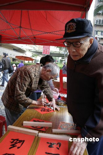 十二月十四日,二00七台北眷村文化节开幕,老人们在活动现场书写对联。中新社发 陈国华 摄