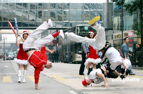 12月18日,香港B-Boys男子跳舞组合在海港城街头大跳hip hop,靓丽圣诞女郎在场打气,宣传倒数迎接圣诞节活动。香港海港城将在24日晚举办盛大的街头派对让市民、游客狂欢倒数迎接圣诞节。中新社发 洪少葵 摄
