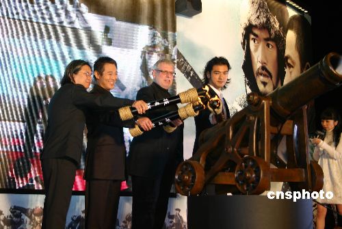 年底最瞩目的华语大片《投名状》十八日晚在台北举行了首映礼。导演陈可辛带领片中明星李连杰、金城武等人参加首映会,并点燃礼花庆祝。中新社发 陈国华 摄