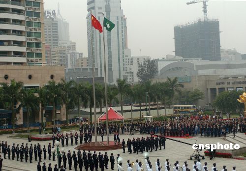 十二月二十日清晨,澳门莲花广场举行隆重的升旗仪式,庆祝澳门特别行政区成立八周年。澳门特首何厚铧、中央人民政府驻澳门联络办公室主任白志健及各界人士出席升旗仪式。中新社发 史利 摄