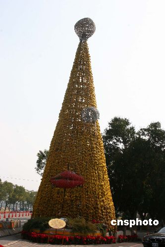 台湾各地圣诞气氛浓郁,圣诞树形形色色。图为云林县古坑乡的“阳光之吻”柳丁圣诞树,使用了约一万三千多公斤柳丁,富有创意、全台首见。中新社发 董会峰 摄