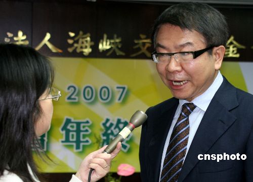 十二月二十七日,台湾海基会在台北举行二00七年终记者会。图为海基会董事长洪奇昌会后接受记者采访。中新社发 董会峰 摄