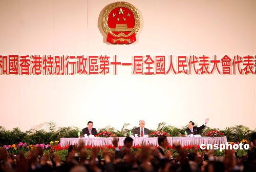 1月3日,第十一届港区全国人大代表选举会议,在湾仔会展中心举行第一次全体会议,选出15名主席团成员,行政长官曾荫权任主席团常务主席。中新社发 洪少葵 摄