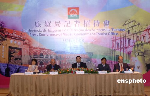 一月九日,崔世安(中)出席澳门旅游局在渔人码头举行的记者招待会并答记者问。当日,澳门旅游局公布﹐2007年澳门入境旅客超过2700万人次,增幅为22.7%。中国内地仍是最大市场,约占整体旅客的55%,其中48%为“个人游”旅客,其次是香港、台湾旅客。中新社发 史利 摄
