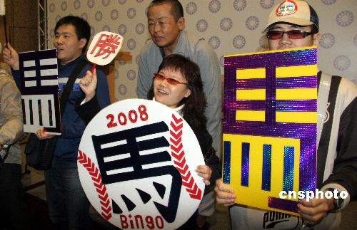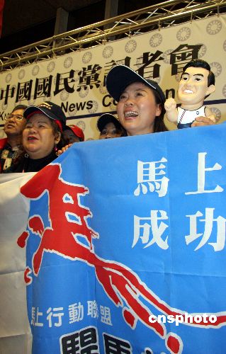 一月十二日晚,支持国民党的民众在台北中国国民党中央党部大楼里欢庆“立委”选举大胜,并打出期盼马英九参加二○○八年“大选”马上成功的标语。台湾第七届“立委”选举当晚揭晓,国民党以八十一席获胜。中新社发 孙自法 摄