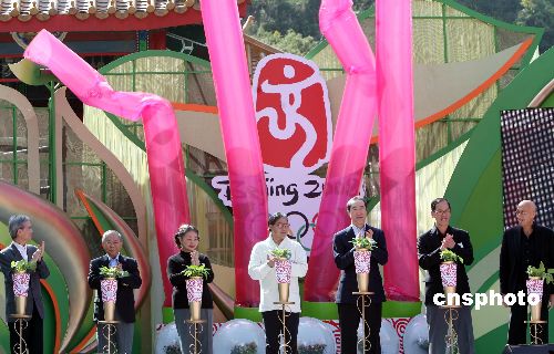 香港特别行政区政务司司长唐英年(右三)、香港奥委会会长霍震霆(右四)等在香港海洋公园出席“齐保育·爱环保”二零零八北京奥运会二百天倒数活动。