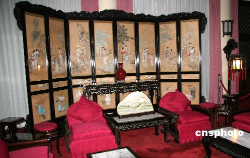 台北中山楼内当年蒋介石的会客厅,一派古色古香。位于台北阳明山的中山楼是为纪念孙中山先生百年诞辰所建,以明清建筑及装饰风格为基调,依山而起、依势而建,占地逾十三万平方米,耗时十三个月建成。中新社发 孙自法 摄