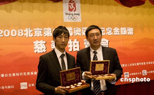 由中国台北奥委会和台湾大洋金银币有限公司共同主办的“二00八北京第二十九届奥运会纪念金银币慈善拍卖会”,将于一月二十七日下午在台北信义诚品店展演厅登场,拍卖所得和拍卖底价的价差,将全数捐给财团法人台湾儿童暨家庭扶助基金会,帮助弱势儿童过好年。图为台湾的上届奥运跆拳道冠军朱木炎(左一),与台湾大洋金银币有限公司总经理毕海(右一),在一月二十五日的记者会上展示将拍卖的二00八北京奥运贵金属金银纪念币。中新社发 陈立宇 摄
