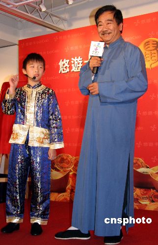 台湾“现代相声之父”王振全(右)与汉霖民俗说唱艺术团小演员即兴表演对口相声,为台北鼠年生肖悠游卡超限量发行造势。