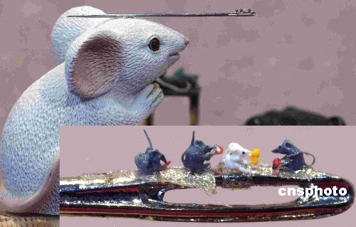 1月27日,台湾微雕大师陈逢显展示自己以树脂为原材料雕塑的当今世界最小的老鼠,以迎接鼠年新春。通过高倍放大镜可欣赏到白鼠头顶绣花针上的微雕作品——栩栩如生的一白三灰四只小鼠(右下),平均每只仅0.27毫米大小。中新社发 孙自法 摄