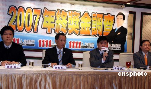一月二十八日,台湾1111人力银行在台北发布其最新完成的二○○七年终奖金大调查,结果显示:与上一年度仅一成三受访者没有年终可领相比,二○○七年有超过三成上班族确定领不到任何年终,增长一百五十三个百分点。一成五企业不发放二○○七年终奖,不赚钱、景气差是主要原因。中新社发 孙自法 摄