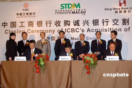 1月28日,“中国工商银行收购诚兴银行交割仪式”在澳门美高梅酒店举行。工商银行同意以约46.83亿元澳门币收购诚兴银行共119900股普通股,占诚兴银行已发行股本总额的79.9333%。诚兴银行是一家成立于1972年的澳门持牌银行,现为澳门旅游娱乐公司集团成员,位居澳门金融市场三甲之列。中新社发 史利 摄
