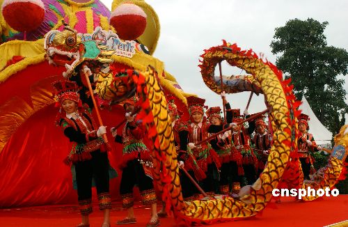 一月三十一日,穿上传统民族服式、来自云南的女子舞龙队在香港海洋公园演绎金龙献瑞,向游客及市民拜年。当日,香港海洋公园公布在农历新年期间,将推出冰上百老汇、金银满冰宫、女子舞龙大汇演、醒狮贺岁等八十八个新春热点。中新社发 蔡蔓莉 摄