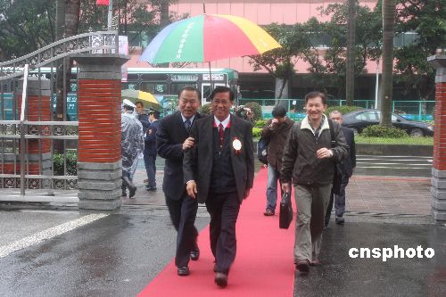 二月一日,台湾第七届“立法委员”办理报到并宣誓就职。资深工作人员亲自为每位“立委”撑伞,口中不断说:“恭喜!恭喜!”中新社发 耿军 摄