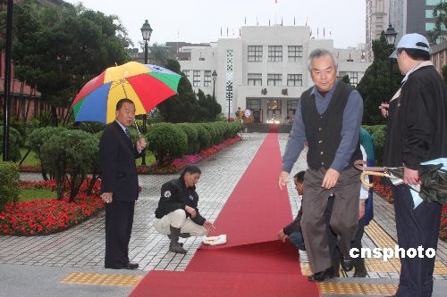 2月1日是台湾第七届“立法委员”办理报到并宣誓就职的日子。清晨,台湾“立法院”的工作人员冒雨从大门口开始铺设通到“议场”的、长达百米的红地毯。中新社发 耿军 摄