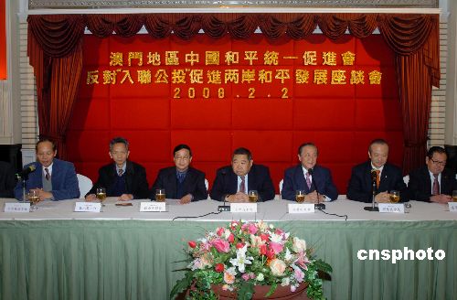 二月二日,澳门地区中国和平统一促进会在万豪轩酒店举行“反对‘入联公投’,促进两岸和平发展”座谈会。专程来澳门的台湾新党主席郁慕明主讲了“两岸关系发展的形式和前景”,与会各界人士也纷纷表达了反对“入联公投”,促进两岸和平发展的心声。中新社发 史利 摄