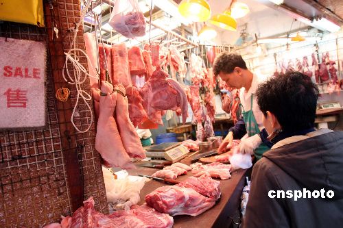 二月五日,香港市民在街市购买新鲜猪肉准备过年。日前,内地大雪阻交通,一度引发供港食品短缺,连日来已得以纾缓。中新社发 洪少葵 摄