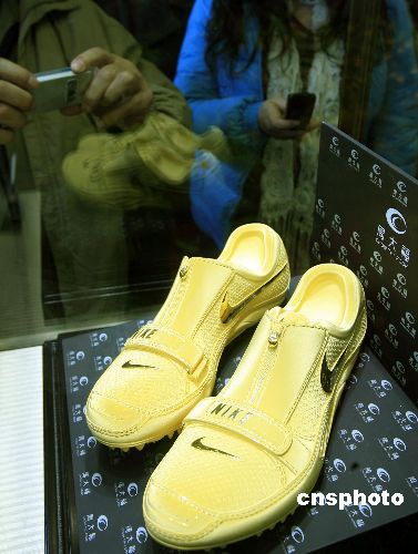 农历新年喜庆时节,香港沙田马场举办黄金艺术珍品展览,展出二十多件设计独特、手工精致的黄金艺术珍品。图中以有世界飞人之称刘翔破世界记录时,以其所穿跑鞋实物原大打造的黄金跑鞋,引来众多观众兴趣。这双黄金跑鞋长二十六厘米,黄金重约十六两,价值超过二十三万多港元。中新社发 王丽南 摄