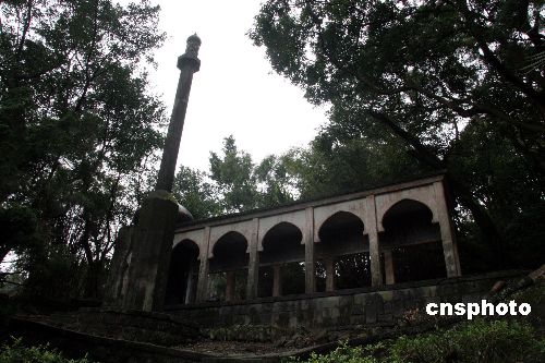 台北市示范公墓中,国民党桂系大将白崇禧长眠于此。一九六六年,白崇禧在台北过世,被家人安葬在白家“白榕荫堂墓园”。墓园最高处,建有“崇禧清真寺”一座,寺前矗立一座似锏一样的冲天柱,锏前刻“忠肝义胆”、后书“仰不愧天”,锏身左右有“桂林白崇禧”书两联:孤臣秉孤忠 五马奔江 留取汗青垂宇宙;正人扶正义 七鲲拓土 莫将成败论英雄。中新社发 徐长安 摄