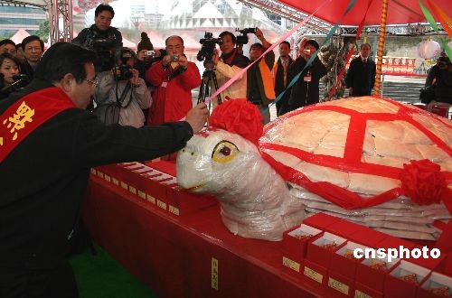 二月十五日,二00八台北花灯节开幕,澎湖县天后宫妈祖受邀前来。按照当地宗教传统,澎湖人员在花灯节现场造乞龟台一座,举行点青官为“元宵乞龟”点青仪式。中新社发 徐长安 摄
