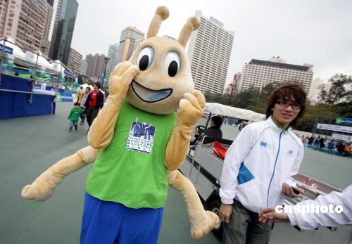 香港渣打马拉松将在周日举行,十六日,组委会在维多利亚公园举行“为地球而跑—环保祝贺行动”,呼吁推动环保。图为吉祥物穿梭会场宣传助兴。中新社发 洪少葵 摄