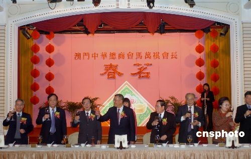 二月十六日晚,澳门中华总商会在万豪轩酒店举行春茗晚宴,澳门特首何厚铧发布演辞并与佳宾举杯共迎鼠年新春。中新社发 史利 摄
