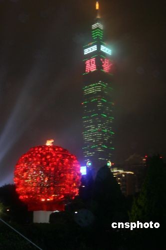 2月中旬,2008台北花灯节在台北市热闹举行,今年主题为“囍迎曙光耀繁城”。主灯(图中红色圆灯)为金鼠娶亲,由一百只造型卡通的老鼠组成,主灯与远处台北一0一大楼交相辉映。中新社发 徐长安 摄