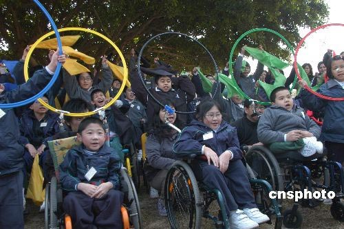 二月二十日是北京零八伤残奥运会倒数二百天,香港不少特殊学校学生参加在彭福公园举行的“北京二零零八年残奥会二百天倒数“仪式。中新社发 谭达明 摄
