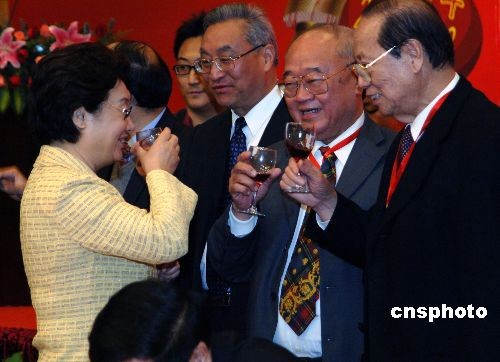 二月二十日晚,中国国侨办主任李海峰(左一)在厦门与前来参加“海峡西岸闹元宵,全球华人盼团圆”活动的海外华人华侨及港澳台同胞共话乡谊。中新社发 王东明 摄