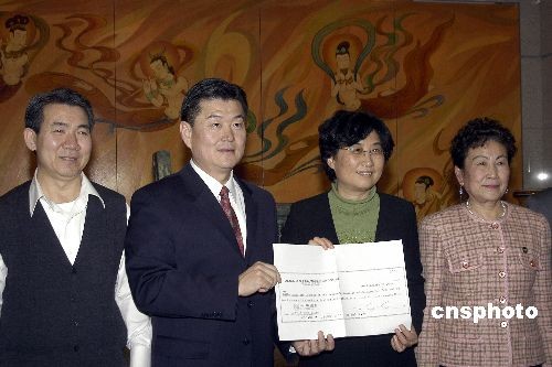 2月25日,纽约华人社团联席会代表20多个华人社团将募集到的五万多美元捐款委托中国驻纽约总领馆转交给中国大陆灾区。图为联席会名誉主席乔立华(左二)和共同主席苏殿奎(左一)等将捐款支票样本交给郝晓飞(右二)副总领事代收。这是中国驻纽约总领馆近来收到的第五笔来自美东华人华侨的捐款。中新社发 邓悦 摄
