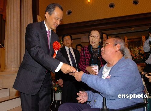 2月27日晚上,日本横滨华侨总会举行“2008新春联欢会”,中国驻日大使崔天凯,日本华侨华人联合总会会长曾德深、日本中华总商会会长黄耀庭、横滨华侨总会会长任政光等出席,来自东京、横滨地区的华侨华人近600人参加。图为联欢会上崔天凯大使按照日本习惯向老人赠送新春“红包”,祝老人健康长寿。中新社发 滕剑峰 摄