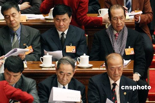 3月3日下午,中国人民政治协商会议第十一届全国委员会第一次会议在北京人民大会堂开幕,党和国家领导人与大会主席团成员在主席台就座。图为大会主席团成员、来自澳门的全国政协委员何鸿燊(二排右一)在主席台上。中新社发 任晨鸣 摄