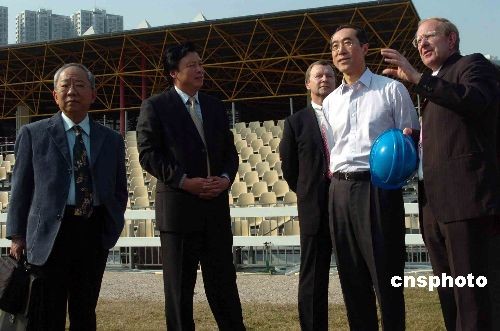 三月四日下午,香港署理行政长官唐英年(右二)与多名局长、警务处长,连同北京奥组委官员参观由沙田香港体育学院改建而成的奥运及残奥马术主要比赛场地和相关配套工程。中新社发 谭达明 摄