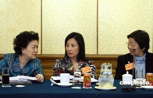 三月四日,全国政协十一届一次会议进行小组讨论常委会工作报告和提案工作情况报告,来自香港的委员朱莲芬(左)、汪明荃(中)与王敏贤,在香港委员小组讨论会上交流。朱莲芬为香港东汇证券有限公司董事长、香港作家协会会长。汪明荃是香港电视广播有限公司艺员。王敏贤任香港大学放射同位素研究所所长。中新社发 盛佳鹏 摄