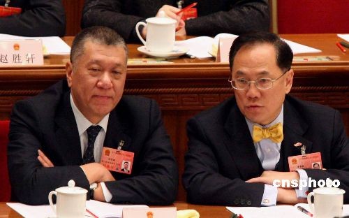 3月5日上午,十一届全国人大一次会议在北京开幕。香港特首曾荫权和澳门特首何厚铧在主席台上。中新社发 张宇 摄