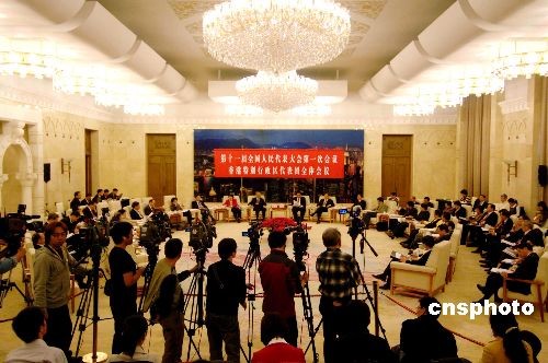 三月五日下午,十一届全国人大一次会议香港特区代表团,在北京人民大会堂香港厅举行全体会议,审议温家宝所作的政府工作报告。众多媒体现场进行采访。中新社发 王东明 摄