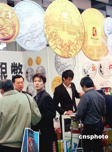 3月7日,为期5天的第21届亚洲国际邮展在台北开幕,展出竞赛类、非竞赛类及荣誉类的展品超过1000框。其中上海版飞雁加印小字邮票,红印花加字邮票和大龙试印票等价值新台币上千万元以上的珍稀邮票,最引人注目。图为一家台湾公司设摊展出北京奥运纪念金银币,并在现场向民众赠送北京奥运吉祥物福娃宣传海报。中新社发 黄少华 摄