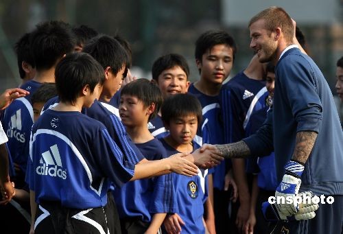 三月七日,英国足球巨星贝克汉姆与洛杉矶银河队的队友在香港指导本地足球小将,推广足球运动。中新社发 武仲林 摄