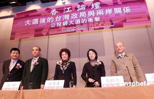 三月十三日,由香江文化交流基金会主办的台湾选举后政局与两岸关系论坛在香港会展中心举行,吸引众多人士到场。图为香江文化交流基金会、香港台湾工商协会会长江素惠(中)、台湾大学政治系名誉教授张麟征(右二)、台湾大学心理系教授黄光国(右)等嘉宾登台和与会者见面。中新社发 洪少葵 摄