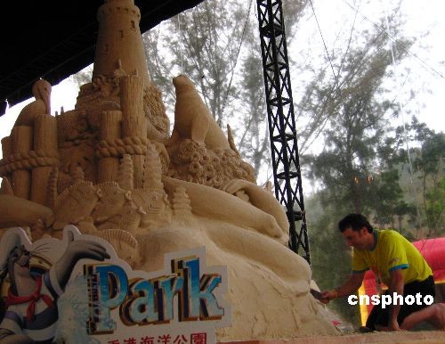 香港海洋公园将于三月二十一日至四月二十日推出“高清动物月”,并将举办香港首个大型沙雕展览,吉尼斯最高及最长沙雕艺术品的纪录保持者Ted Siebert及其队友将以二百吨沙进行创作。图为十八日,一位艺术家正在进行沙雕创作。中新社发 陈伊敏 摄